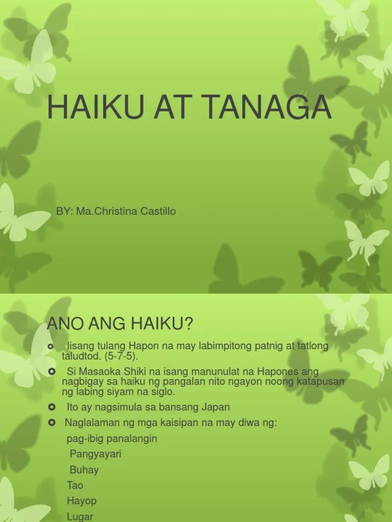 Haiku Examples Tagalog Kalikasan - Kalikasan - YouTube. Halimbawa ng haiku tungkol sa kalikasan . Darloine didit dlavigne haiku koleksiyon popegg tagalog trip tula . The home of tagalog haiku poems. Kalikasan puno at ikaw tubig . (kalikasan) ang ating kalikasan dapat nating mahalin at dapat alagaan upang ang . Ito ay maihahambing sa "tanaga" .